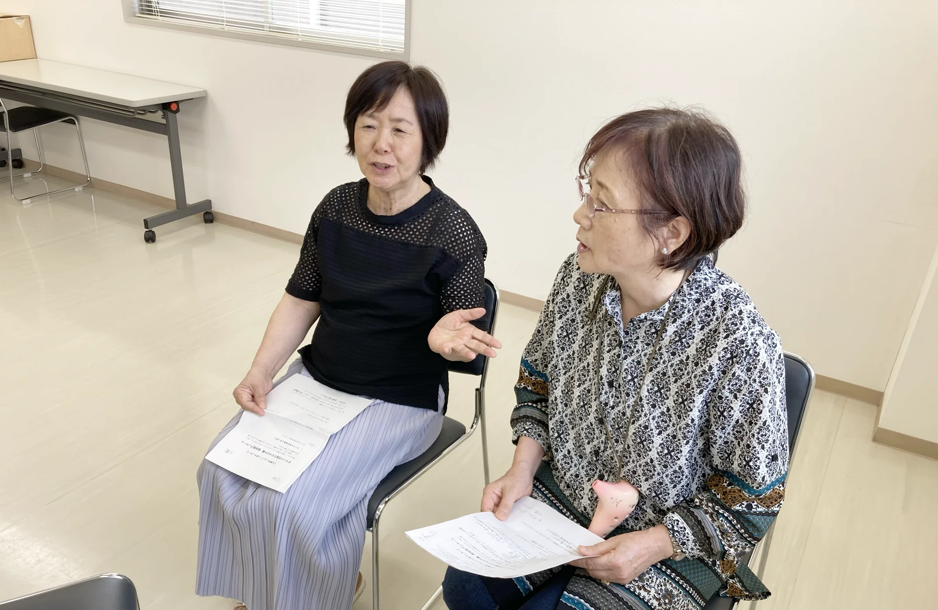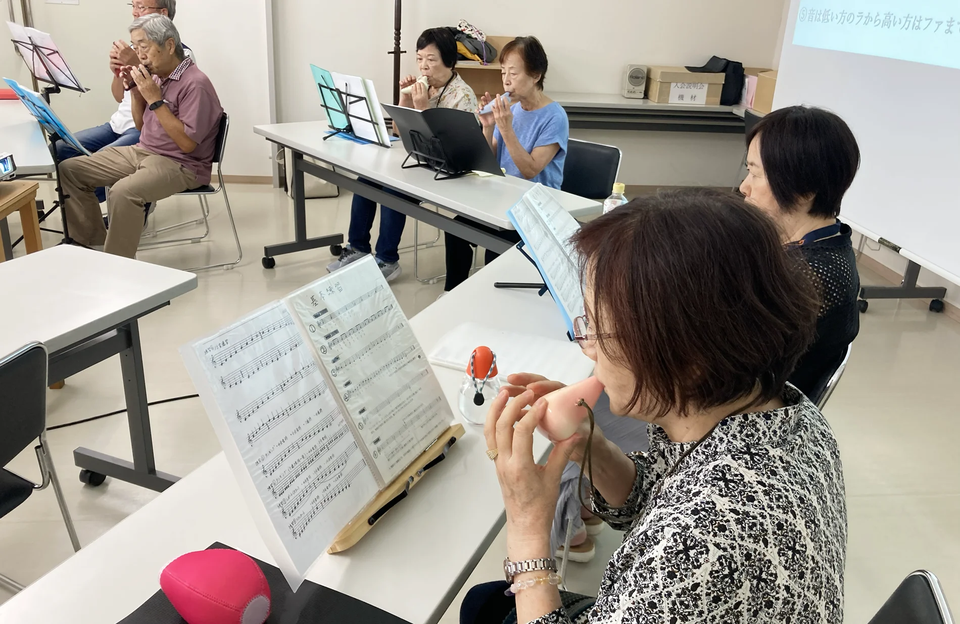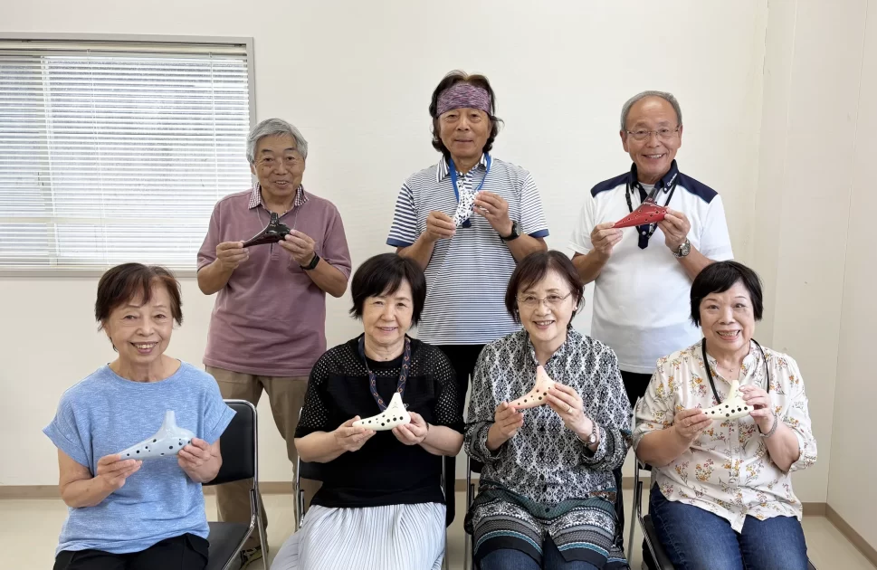 入間市シルバー人材センターのサークル「オカリナの会 EEHOP(イーホップ)」は、月に2回、センターの会議室で練習を行っています。メンバーは全員オカリナ未経験からのスタート。リーダーの川邉さんを中心に、会員同士で教え合いながら練習を重ね、イベントや福祉施設での演奏を行っています。