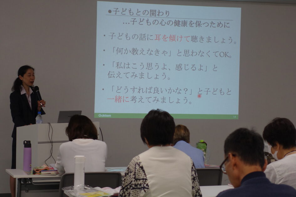 子どもの見守りにおける観察ポイント、食事・着替えの援助や子どもの心の健康を保つための関わり方などグループディスカッションを交えながら、お話しされました。