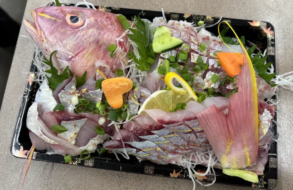 糸撚鯛(イトヨリダイ):表面を軽く炙り、豪華なお頭付きのお造りに。