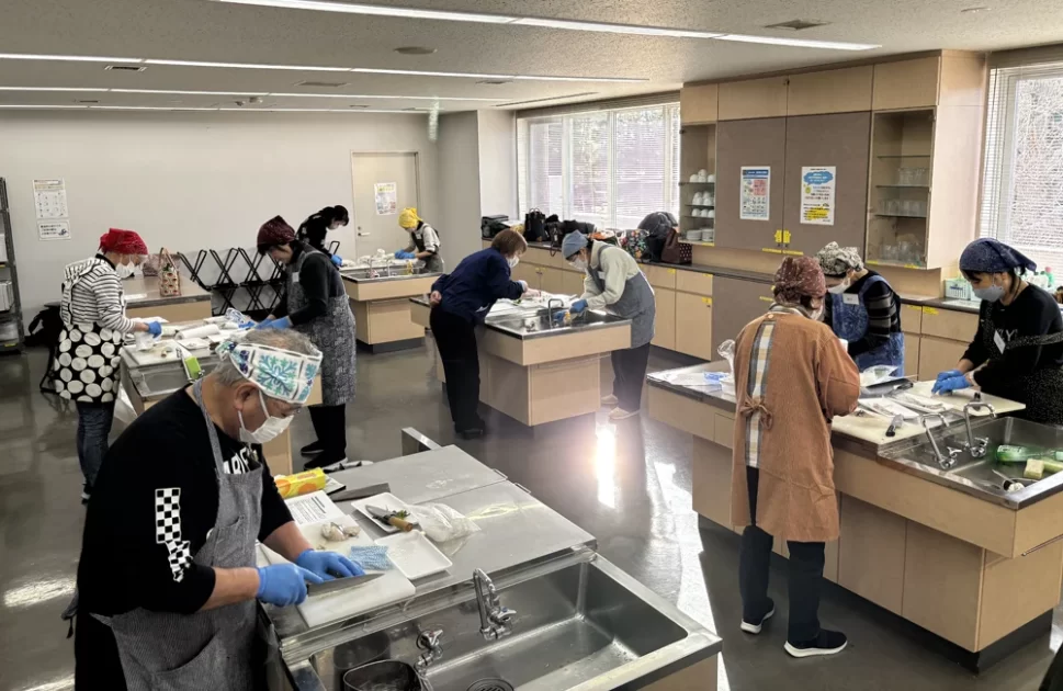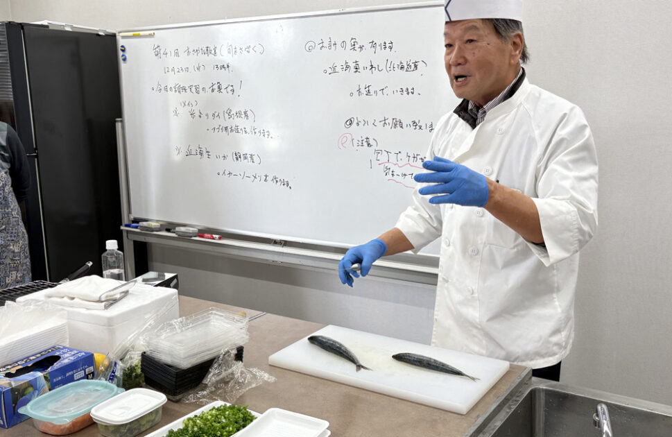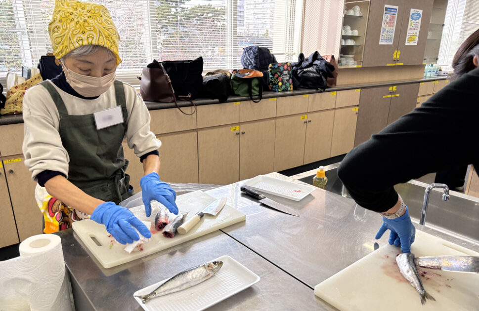草加市文化会館の実習室。ここで行われているのが、草加市シルバー人材センターの独自事業「旬の魚をさばく」です。